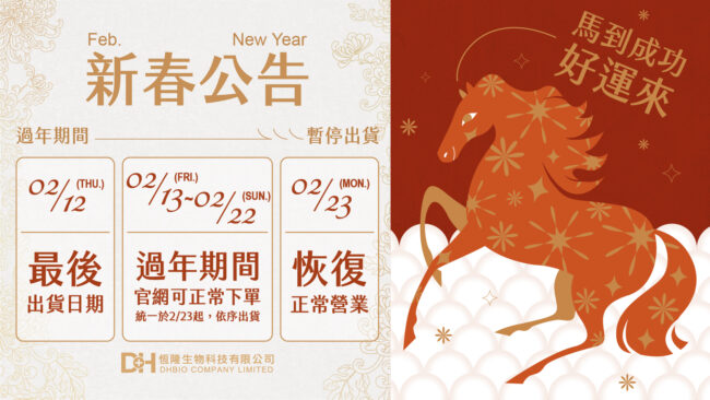 為配合過年假期,我們將於 於 2/13(五)至 2/22(日)暫停出貨,過年補給不中斷,歡迎至 全台各大實體藥局 選購,健康即刻到位!