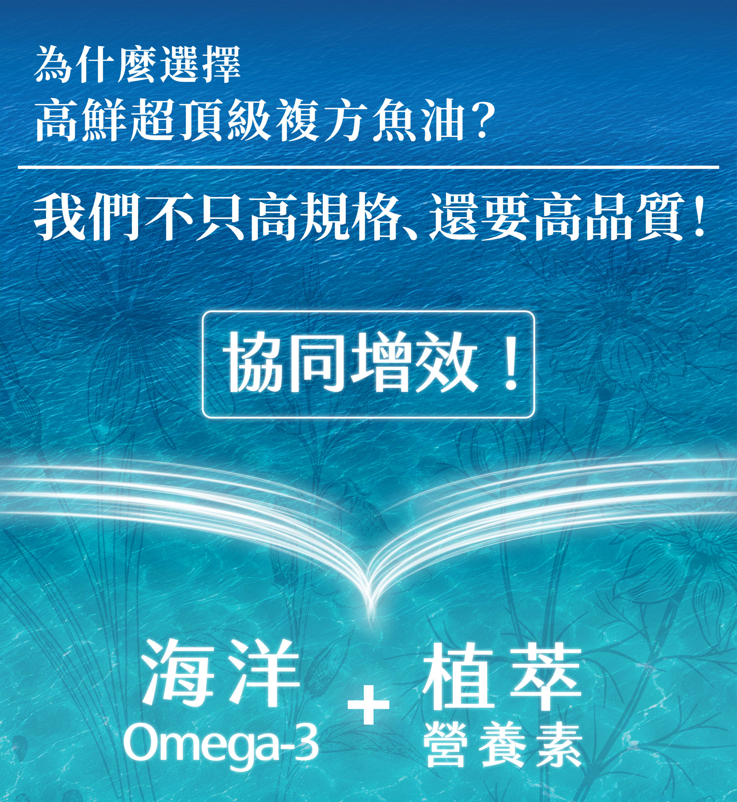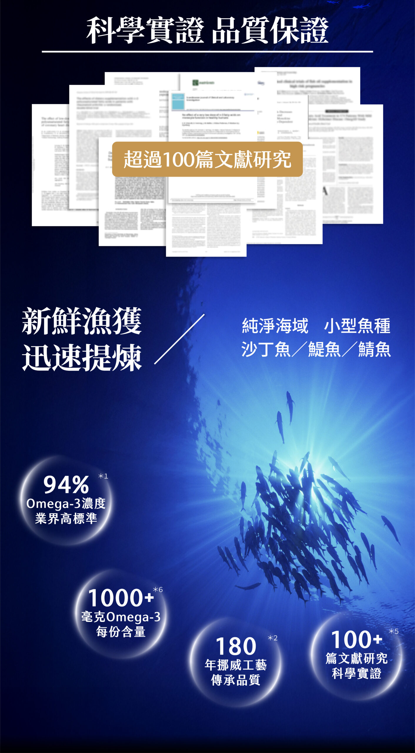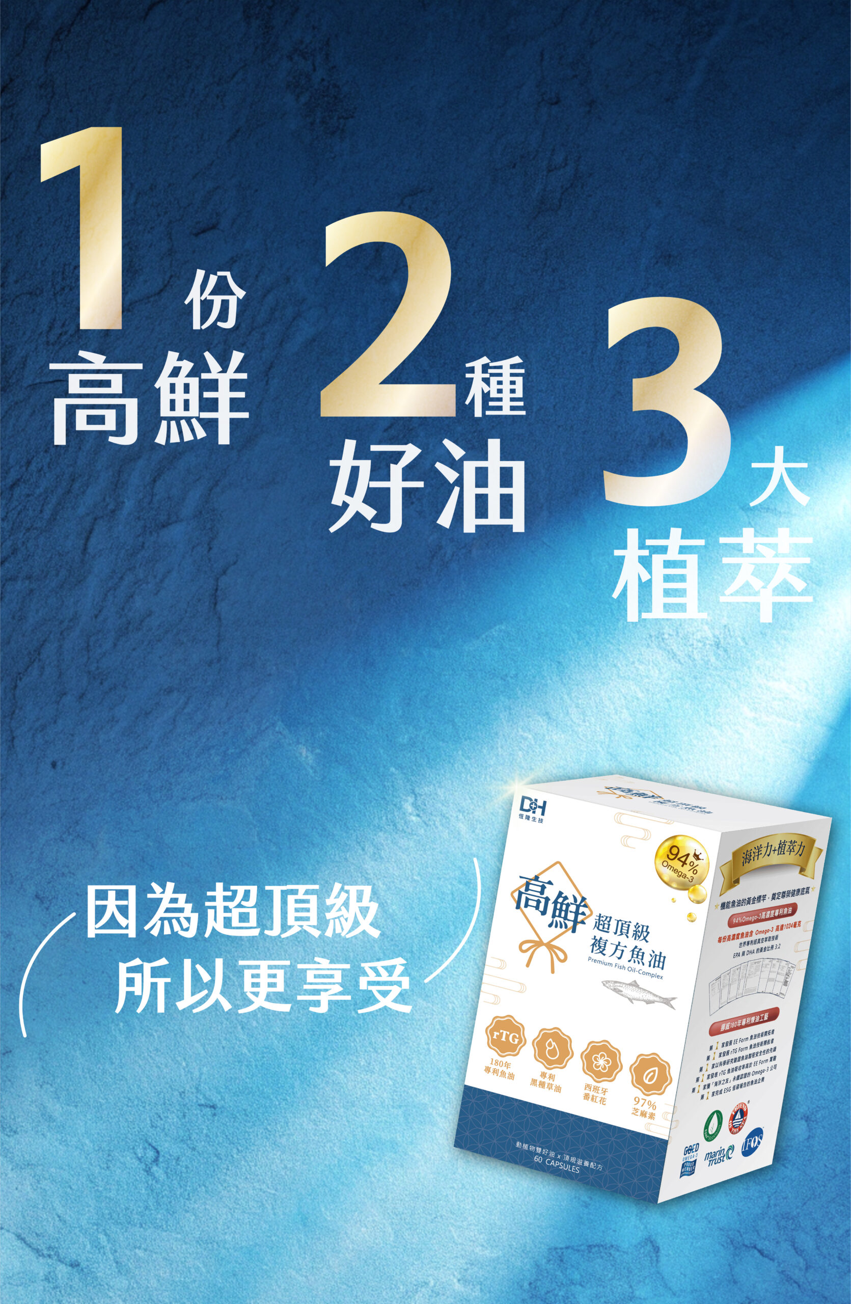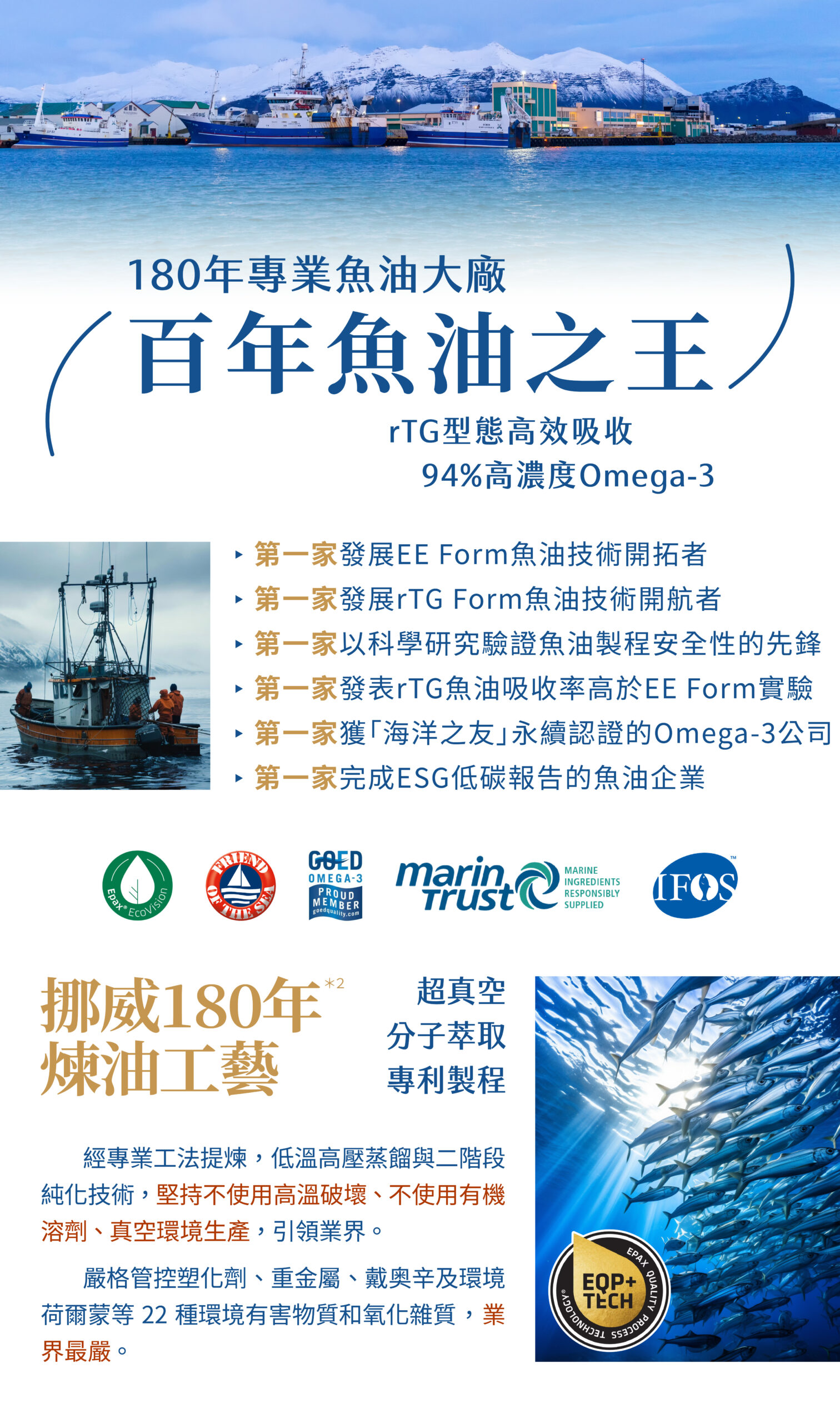 魚油為魚的脂肪萃取出的油脂,含有Omega-3不飽和脂肪酸(包含EPA+DHA)。