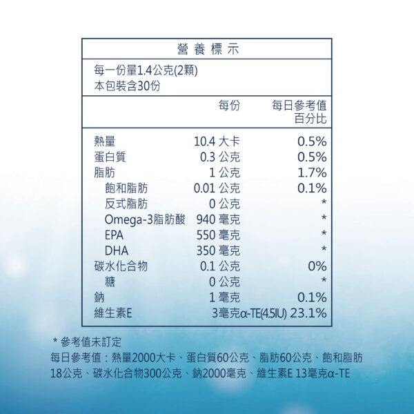 魚油為魚的脂肪萃取出的油脂,含有Omega-3不飽和脂肪酸(包含EPA+DHA)。