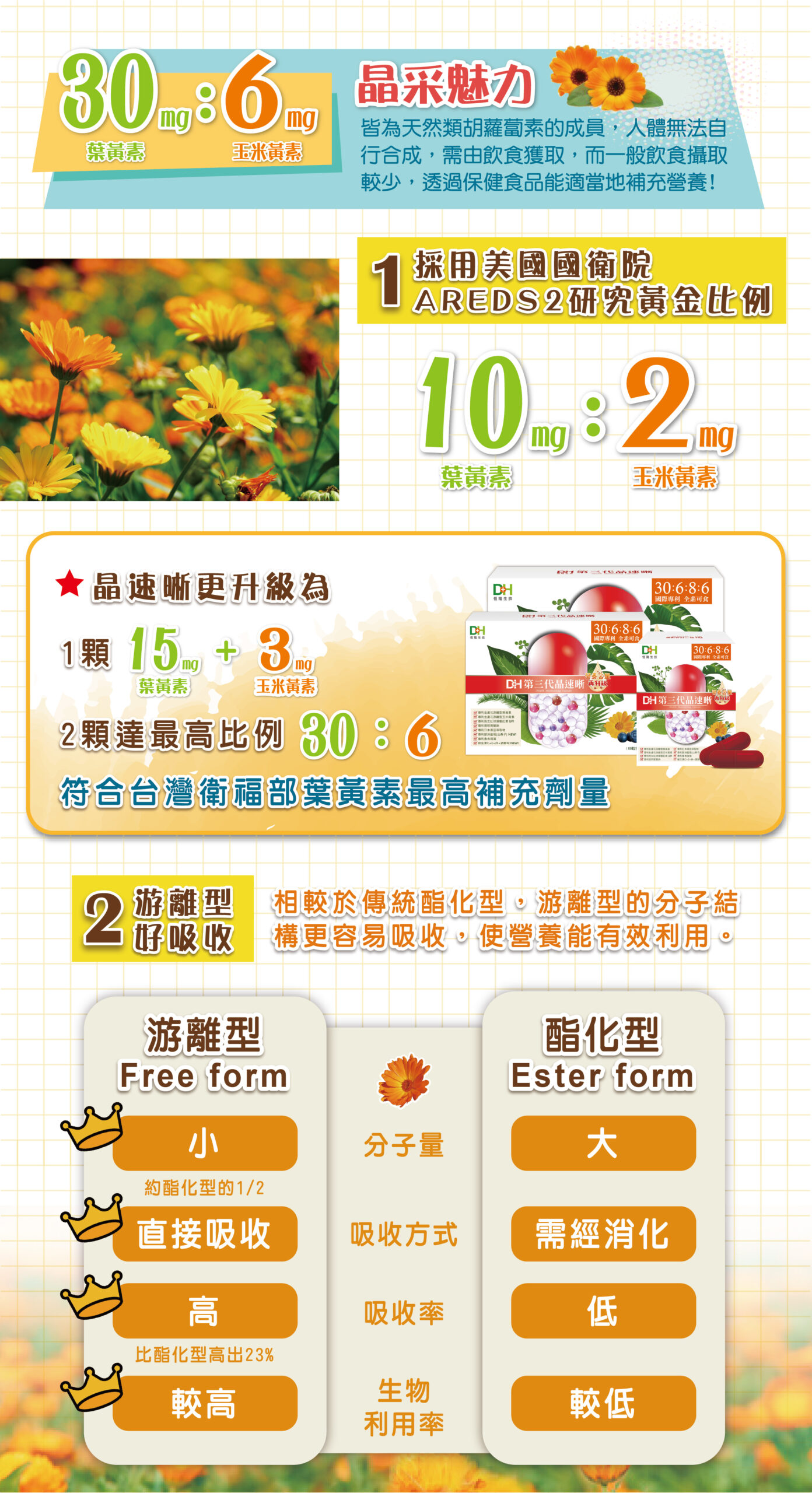 第三代晶速晰除了葉黃素:玉米黃素=30:6 黃金比例足量添加,更將蝦紅素添加到8毫克,一日最高劑量,搭配6毫克 95%高純度透明質酸鈉等複方成分,幫助調節生理機能,是晶亮調節的好幫手。