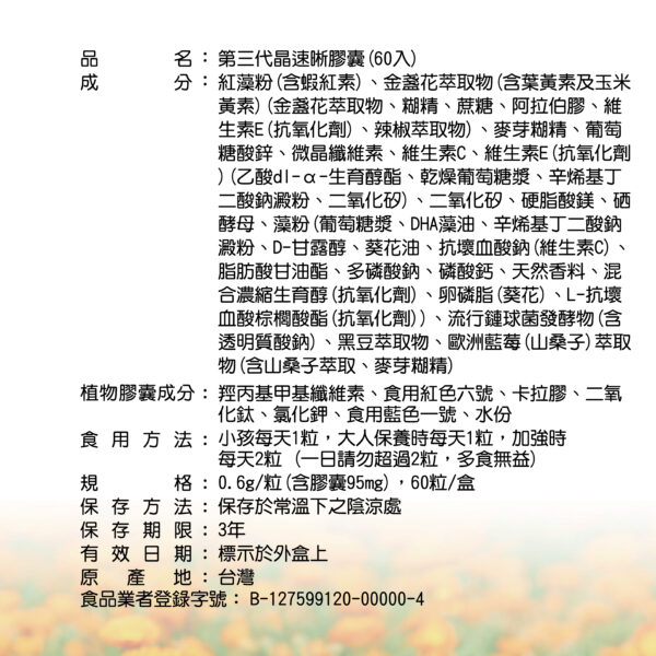第三代晶速晰除了葉黃素:玉米黃素=30:6 黃金比例足量添加,更將蝦紅素添加到一日最高劑量8毫克,搭配6毫克95%高純度透明質酸鈉等複方成分,幫助調節生理機能,是晶亮調節的好幫手。